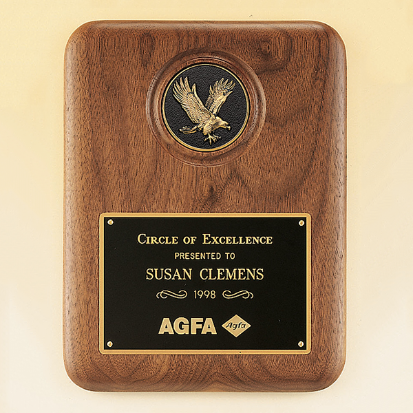 Eagle Award, recognize excellence. Solid American walnut plaque with a precision elliptical edge and sculptured metal eagle medallion casting with black and gold finish Laser engravable plate(s). Solid brass engraving plate(s). Individually boxed.