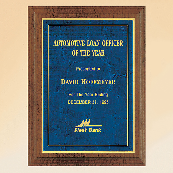Solid American walnut plaque with marble finished plates, available in three colors: sapphire, emerald and ruby. Laser engravable brass engraving plate. Individually boxed. Plaque plates copyright design: TMC 1996
