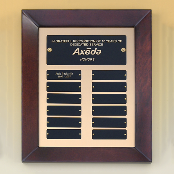 Hand rubbed cherry finish frame perpetual plaque with 12 black brass plates on brush metal gold background Individual plates are 1″ x 3-1/4″. Laser engravable brass plate(s). Individually boxed.