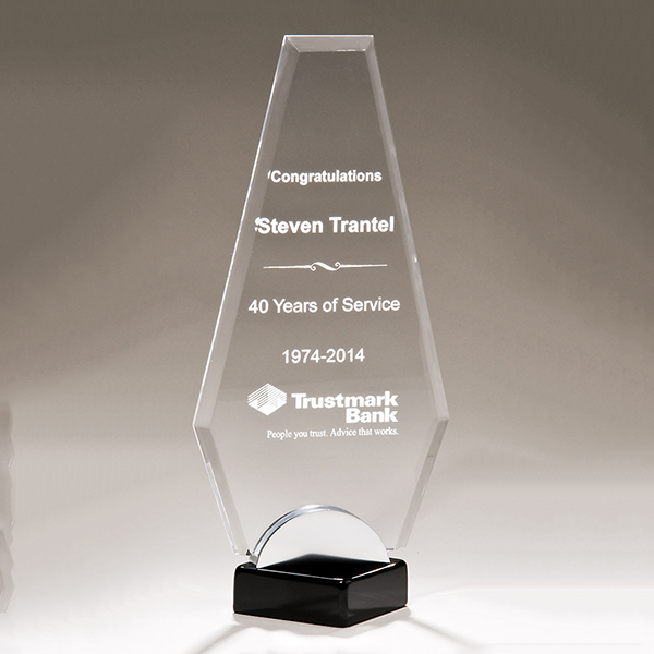 Flame Series acrylic black and silver metal base. 3/8″ thick acrylic clear only. Individually gift boxed.