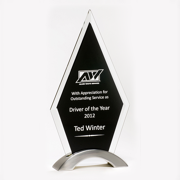 Beveled clear 3/8” thick glass with black silk screen, silver aluminum base. Glass uprights are removable. Individually gift boxed. Suitable for laser engraving.