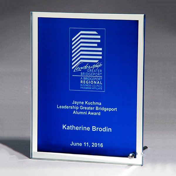 Glass plaque with blue silk screened center and mirror border. Silver post allows portrait or landscape positioning. Silk screened glass laser engrave only. These Glass Plaques are packaged in satin-lined, padded gift boxes.