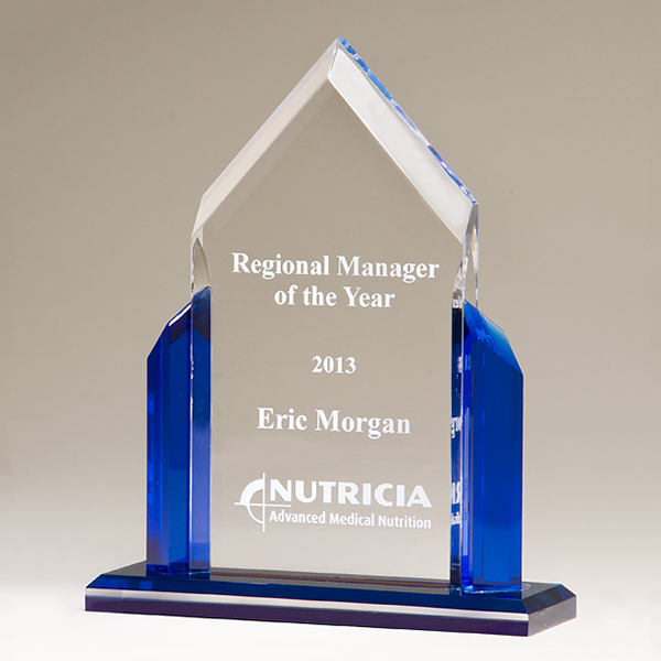 Peak Series acrylic with blue accents, black base with blue mirror top. ¾”thick clear acrylic. Individually gift boxed.
