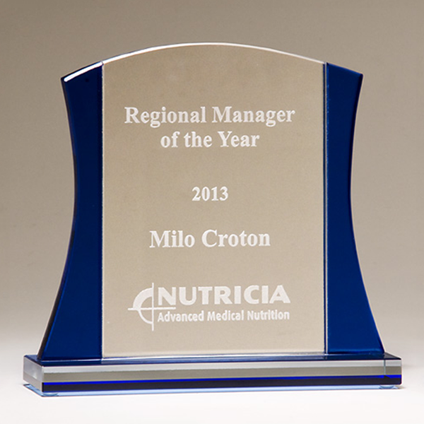 Premium Series glass award. Clear glass upright with blue accents. 3/8″ thick glass, suitable for laser engraving or sandblasting. These Glass Awards are packaged in satin-lined, padded gift boxes.