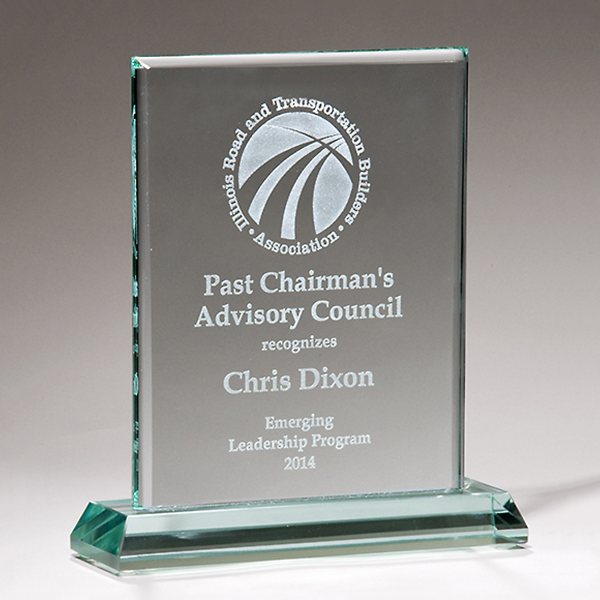 Premium Series jade glass award. 1/2 thick glass, suitable for laser engraving or sandblasting. These Glass Awards are packaged in satin-lined, padded gift boxes.