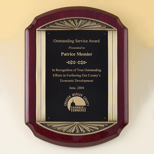Elegant and impressive, the best Airflyte has to offer. Rosewood stained piano finish plaque with our Sunburst antique bronze finished frame casting and black brass engraving plate. The same production techniques used to give expensive grand pianos their glossy look is available as a recognition award. Over six layers of lacquer are hand applied and polished to create our plaque boards. Laser engravable brass plate(s). Individually boxed.