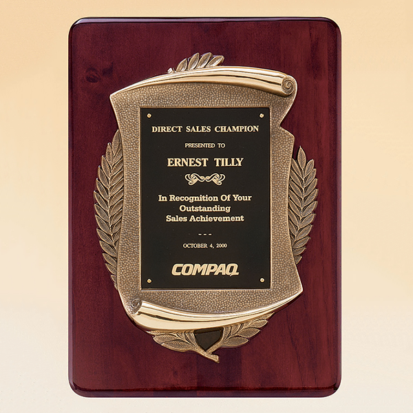Rich, heavy lacquer coating. Rosewood stained piano finish plaque with an antique bronze finished frame casting. Laser engravable plate(s). Solid brass engraving plate(s). Individually boxed. Plaque plates copyright design: TMC 1999