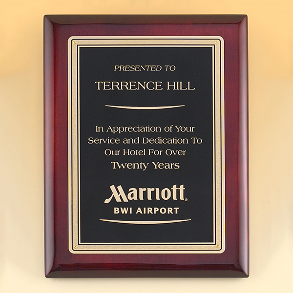 Rosewood stained piano finish Airflyte board, black brass plate with gold Florentine border. The same production techniques used to give expensive grand pianos their glossy look is available as a recognition award. Over six layers of lacquer are hand applied and polished to create our plaque boards. Laser engravable textured brass plate(s). Individually boxed.