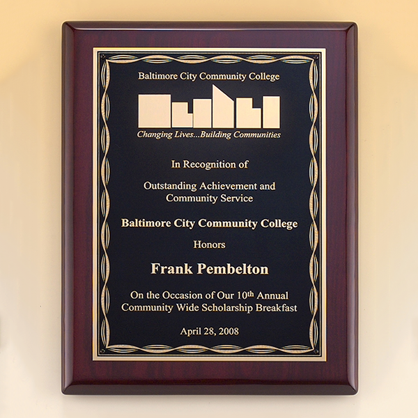 Rosewood stained piano-finished board with gold Florentine scallop design border engraving plate. The same production techniques used to give expensive grand pianos their glossy look is available as a recognition award. Over six layers of lacquer are hand applied and polished to create our plaque boards. Laser engravable brass plate(s). Individually boxed.